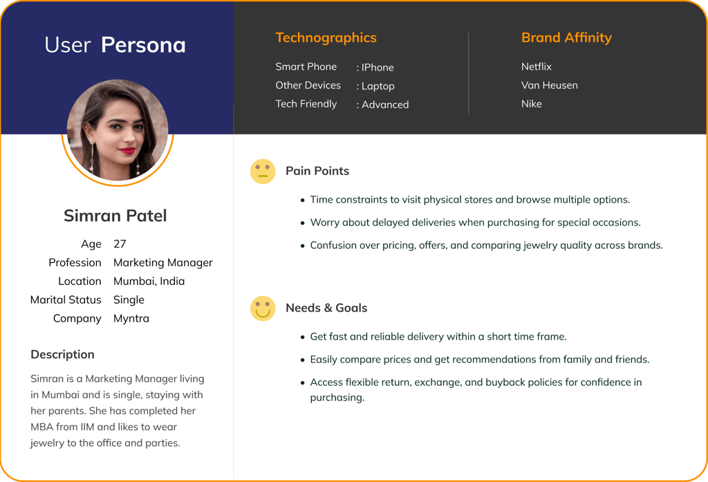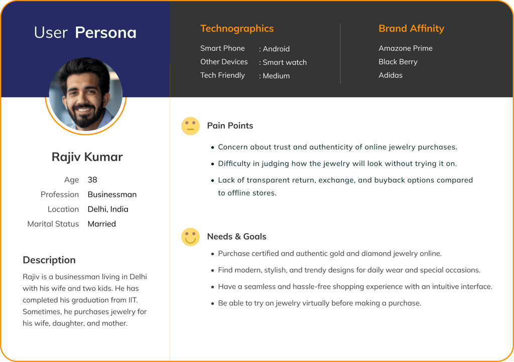 Despite the growing trend of online jewelry shopping, many users hesitate to make high-value purchases due to concerns about authenticity, quality assurance, and the inability to try jewelry before buying. Additionally, customers seek a seamless and hassle-free shopping experience with modern, stylish designs, fast delivery, and flexible return or buyback options. BlueStone needs to address these challenges by building trust, enhancing usability, and introducing innovative features that make online jewelry shopping as convenient and reliable as an in-store experience.